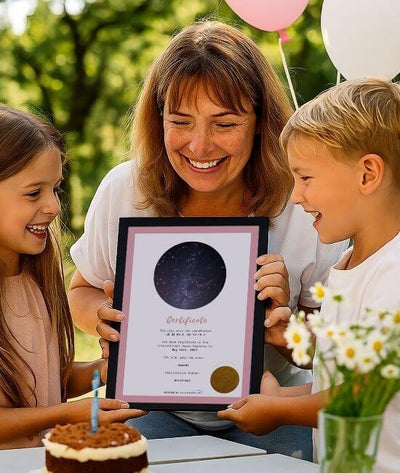 Your star is registered immediately in the International Space Registry. You’ll receive your digital certificate by email right away — the complete gift box arrives within 2–4 days.